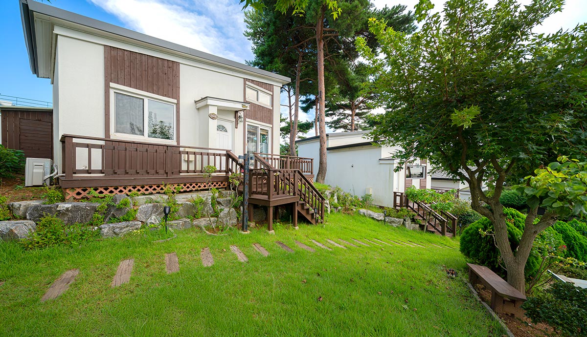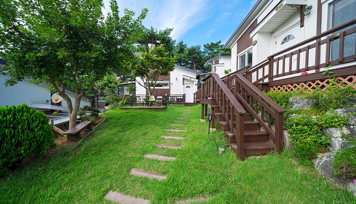 싱그러운 초록 잔디와 아담한 꽃나무들이 바람에 흔들리며