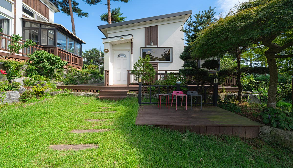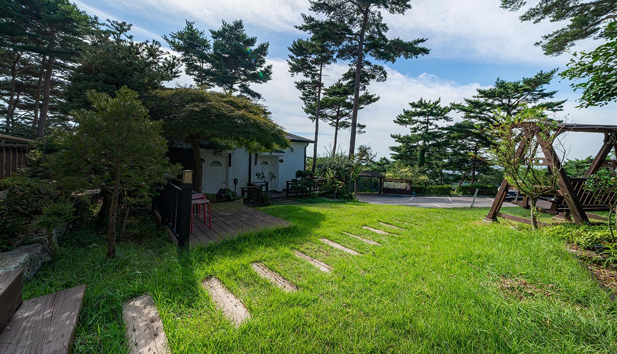 싱그러운 초록 잔디와 아담한 꽃나무들이 바람에 흔들리며