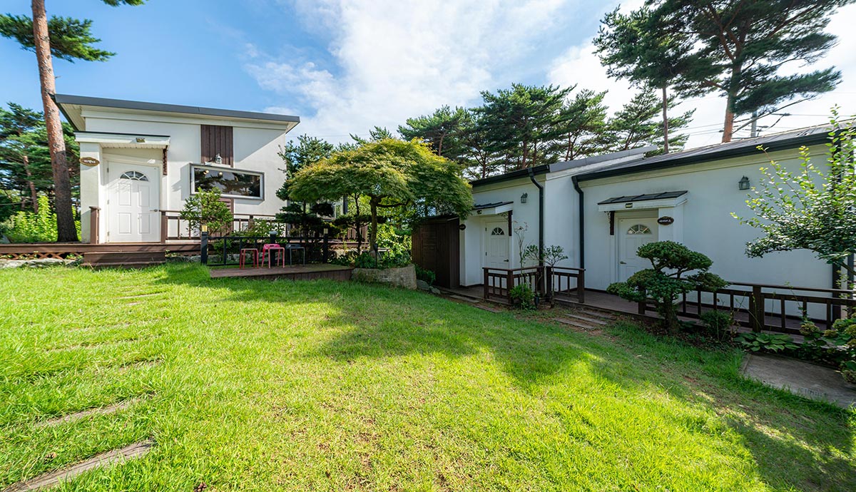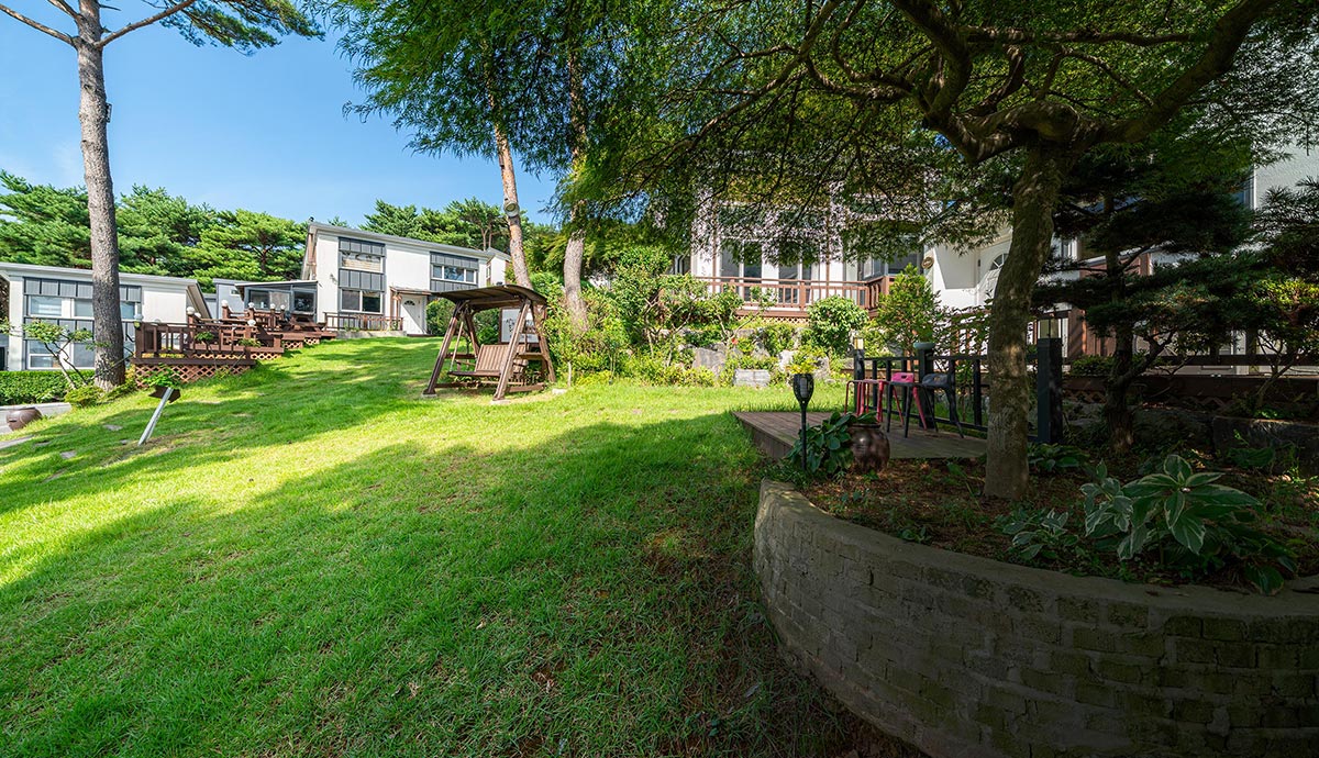 싱그러운 초록 잔디와 아담한 꽃나무들이 바람에 흔들리며